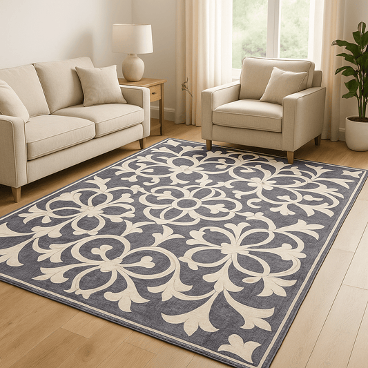 Alfombra Decorativa de Diseño Floral Gris & Blanco