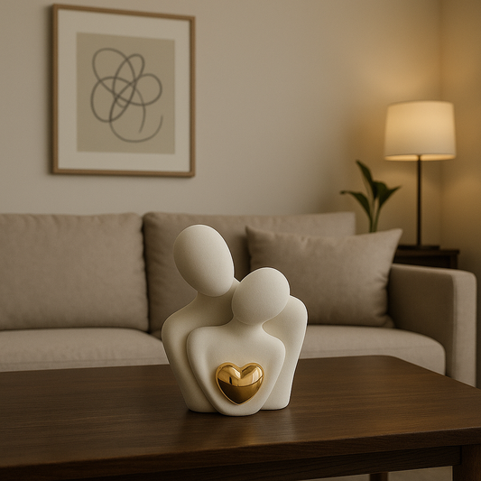 Escultura decorativa de pareja con corazón dorado – Estilo minimalista moderno en blanco y oro