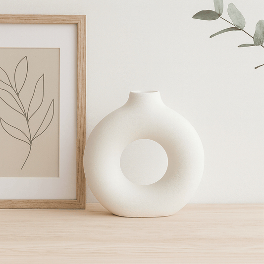 Jarrón Decorativo Blanco Minimalista en Cerámica – Diseño Circular Moderno