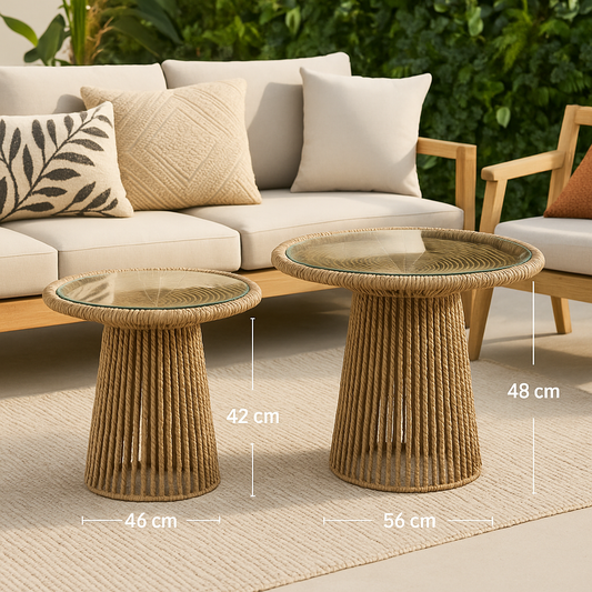 Mesas Laterales con Base de Cuerda Tejida de Yute y Cubierta de Vidrio – 2 Tamaños
