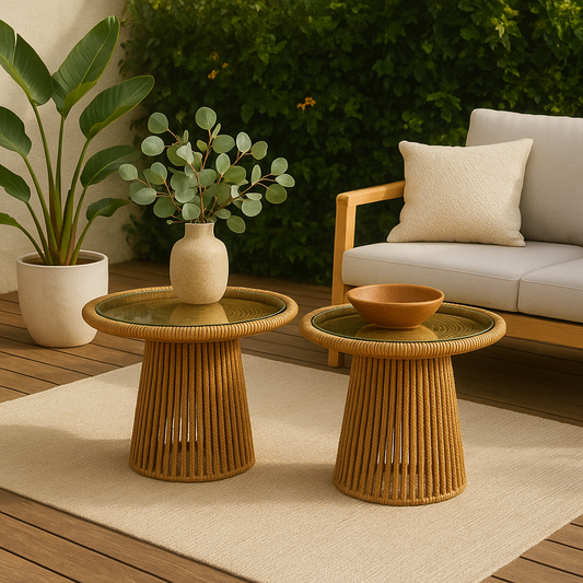 Mesas Laterales con Base de Cuerda Tejida de Yute y Cubierta de Vidrio – 2 Tamaños
