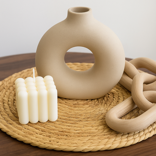 Pack Decorativo Minimalista con Jarrón Circular, Cadeneta de Madera, Vela Cube y Base de Yute + ENVIO GRATIS + REGALO SORPRESA 🎁