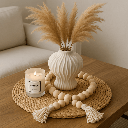 Pack Decorativo “Encanto Natural” – Jarrón + Guirnalda de Madera + Vela Aromática + Base de Yute + "ENVIO GRATIS y SORPRESA🎁"