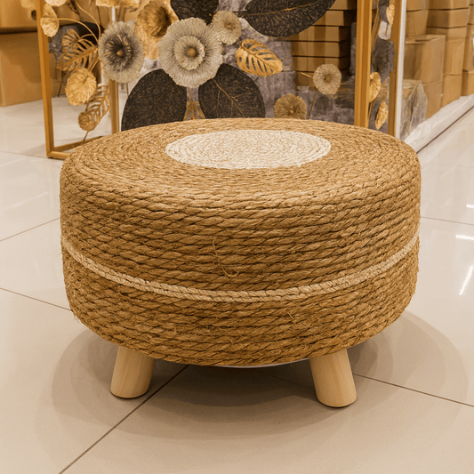 Puff Redondo de Yute Natural con Patas de Madera – Asiento Decorativo Boho