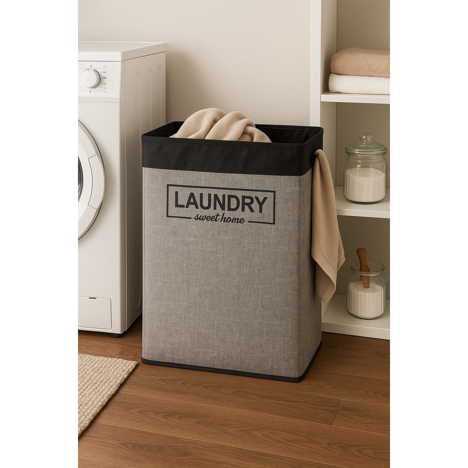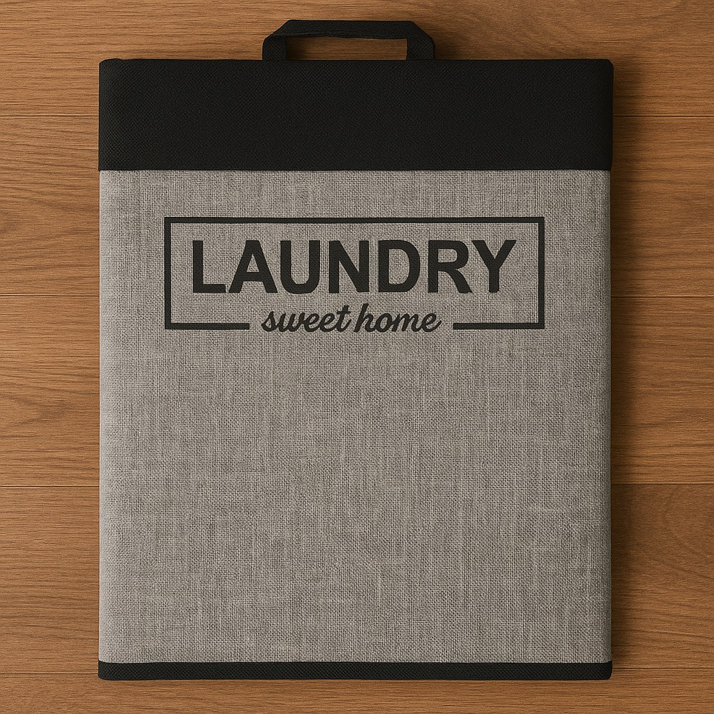 Organiza tu lavandería con estilo gracias a esta cesta de ropa plegable. Su diseño en tonos gris y negro, junto con la frase “Laundry Sweet Home”, aporta un toque moderno y funcional a tu hogar.