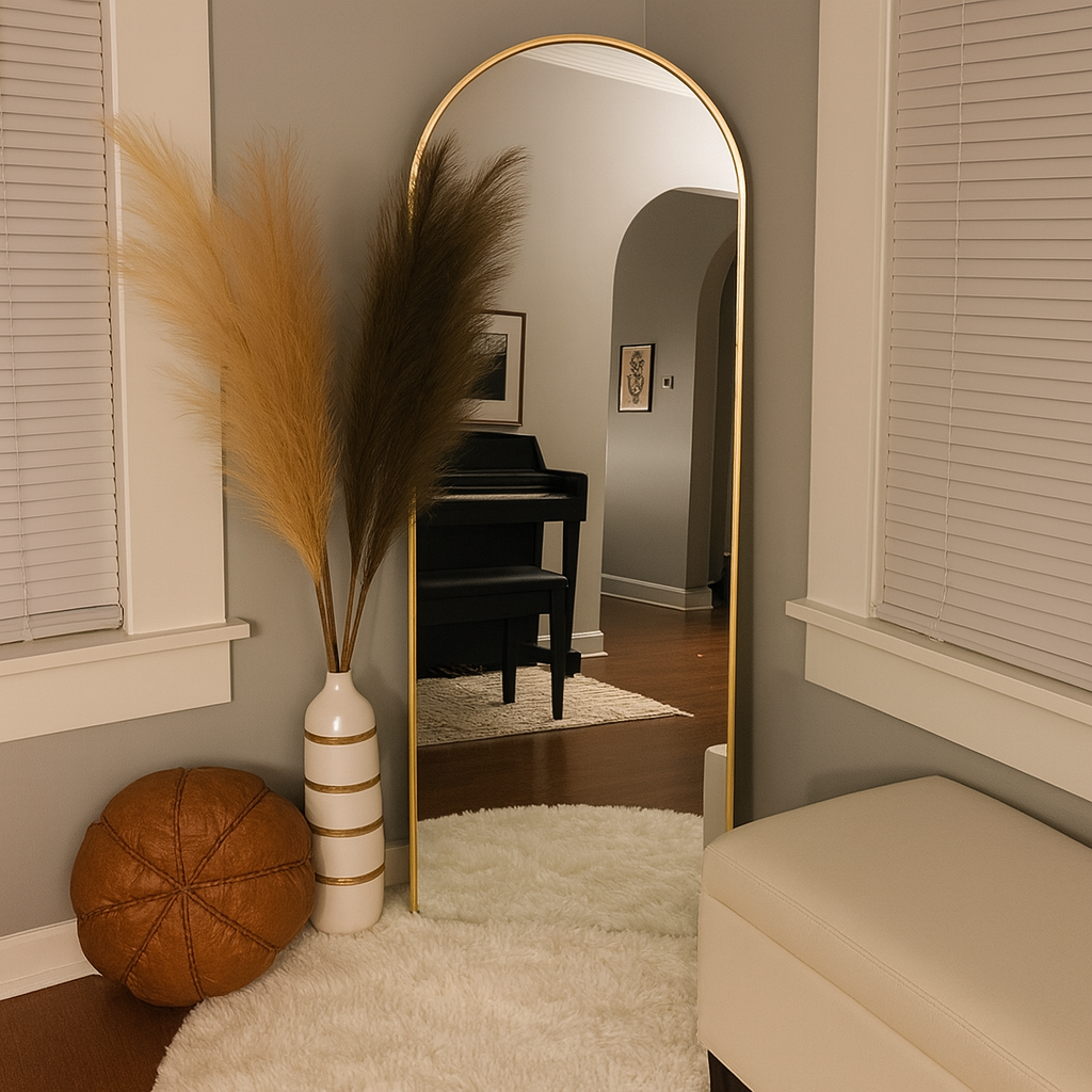 Este elegante espejo de pie con forma de arco y marco metálico en dorado es el complemento perfecto para añadir amplitud, luz y sofisticación a tu hogar. Con sus medidas de 152x42 cm, resulta ideal para dormitorios, vestidores o salas, permitiéndote verte de cuerpo completo mientras realzas la decoración con un toque moderno y chic. Su diseño versátil lo hace perfecto tanto apoyado en el suelo como guindado en pared para decorar tu rincón.
