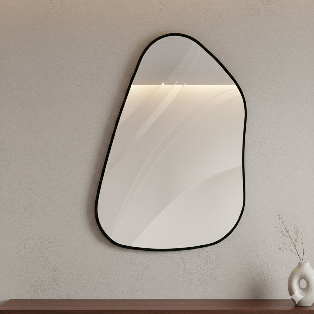 Dale un toque moderno y artístico a tu decoración con este Espejo Decorativo Orgánico. Su forma irregular y su marco negro minimalista lo convierten en el complemento perfecto para espacios contemporáneos o boho.