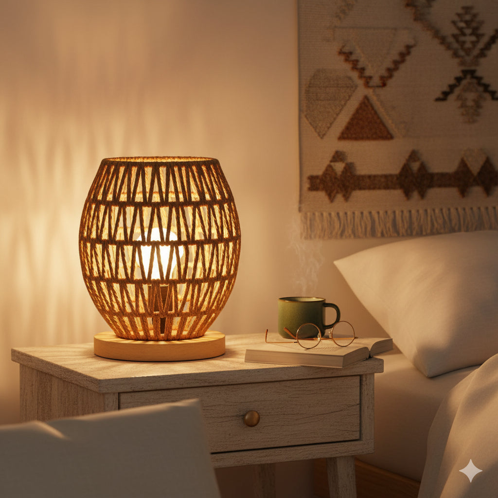 Ilumina tus espacios con encanto artesanal gracias a esta lámpara de mesa de yute tejido a mano. Su diseño entrelazado permite que la luz se filtre suavemente, creando un ambiente cálido y acogedor. La base de madera natural aporta estabilidad y un toque rústico que combina a la perfección con estilos boho, nórdico o costero. Ideal para mesas de noche, salas o rincones decorativos, esta lámpara fusiona funcionalidad y estilo en una pieza única.