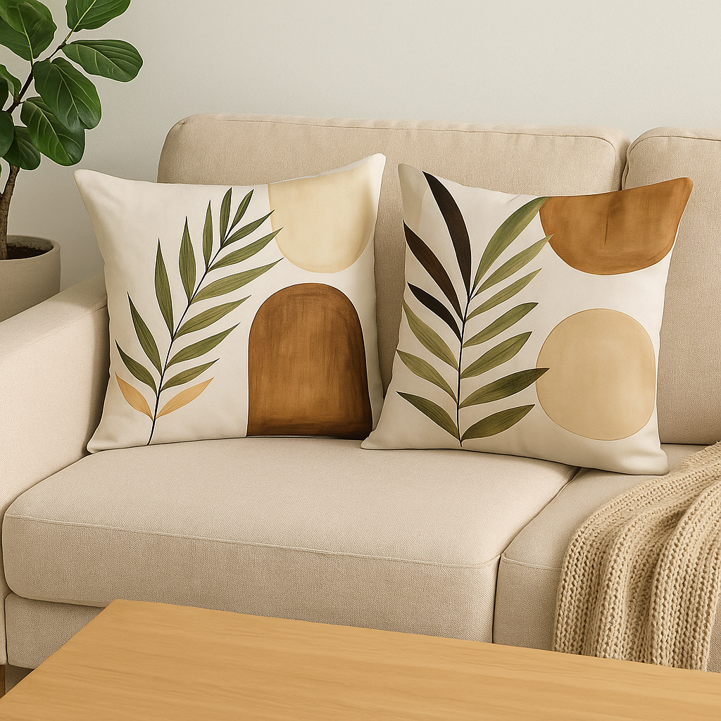 Set de Fundas de Cojines Abstractos con Hojas Verdes y Tonos Tierra – Pack de 2 Unidades
