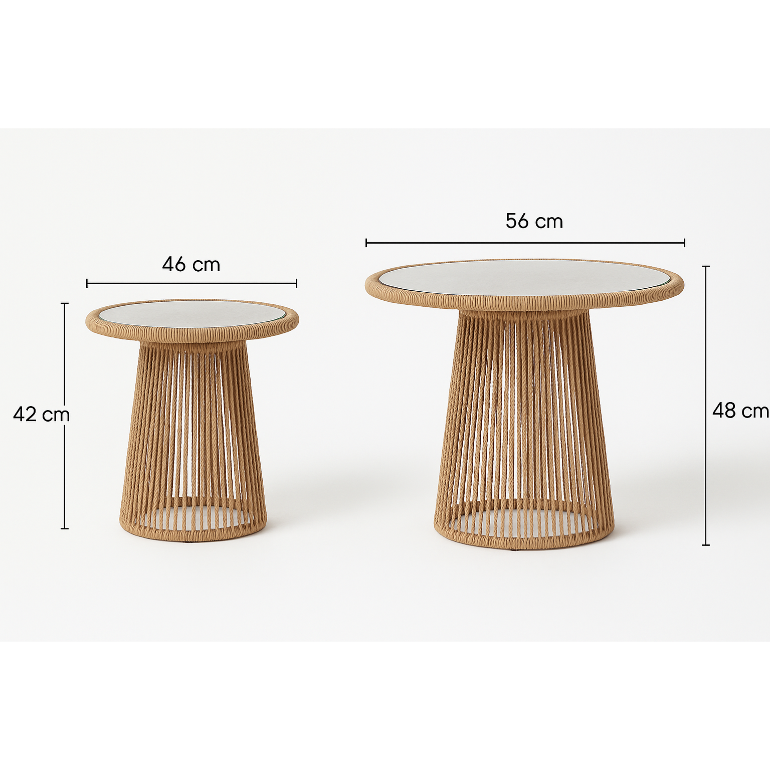 Decora tu sala, terraza o cualquier rincón con estas hermosas Mesas Laterales que combinan textura natural y diseño moderno. Su base tejida en cuerda aporta calidez y su cubierta de vidrio templado añade un toque sofisticado.